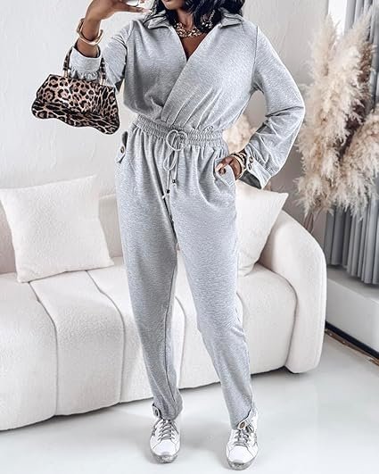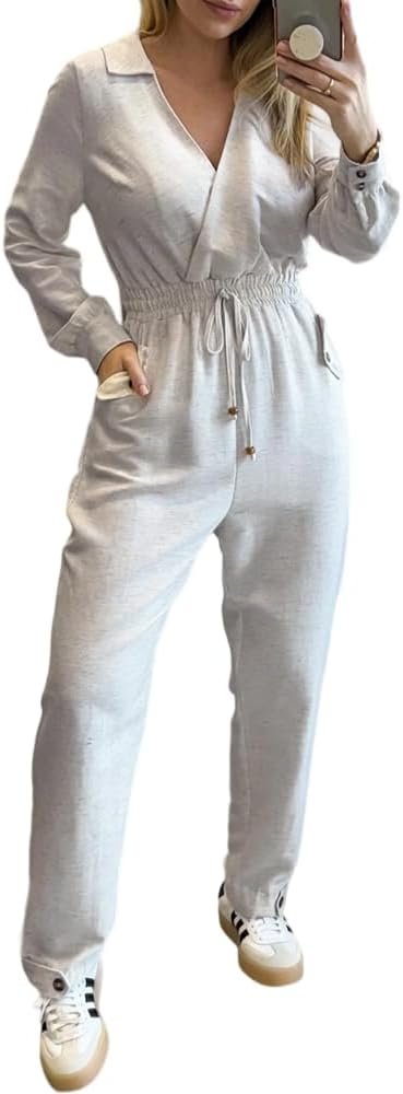 V-Neck Long Sleeve Drawstring Waist Jumpsuit with Side Pockets.