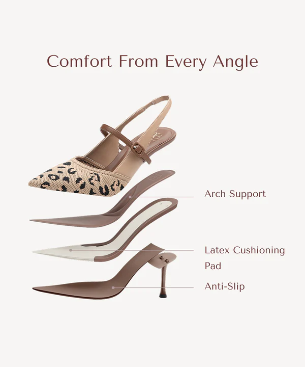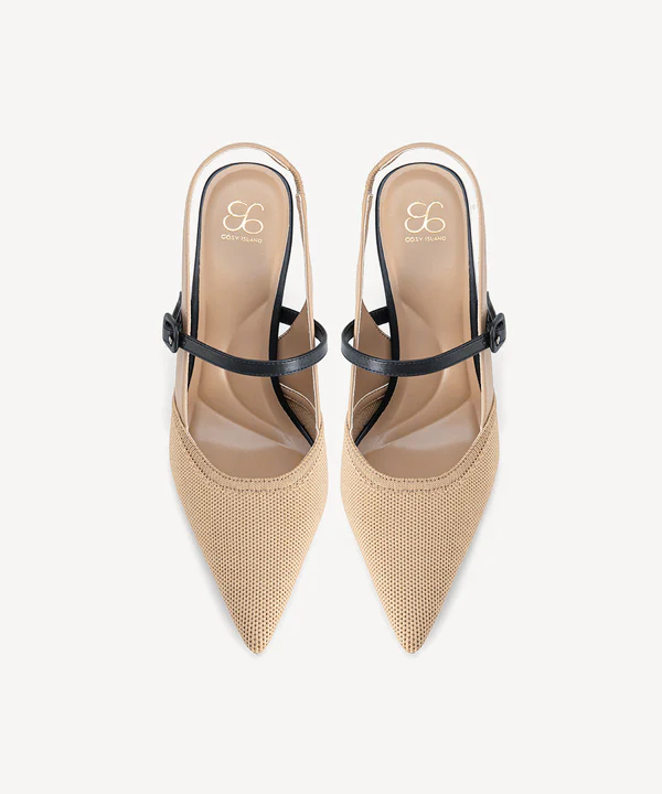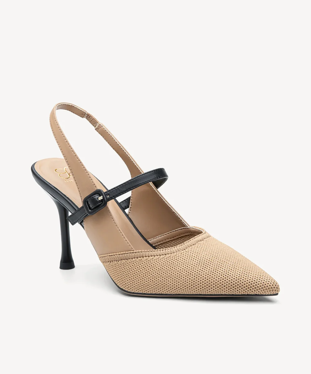 • The Elegant Stiletto Heeled Sling back combines a sleek Fly Woven/PU upper with a pointed toe and 8.5cm (3.35 inches) stiletto heel for a refined look.