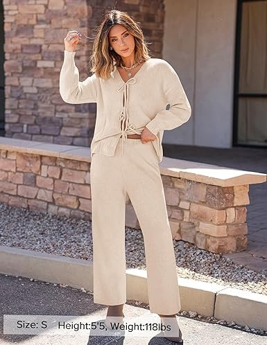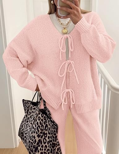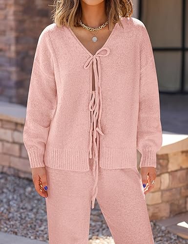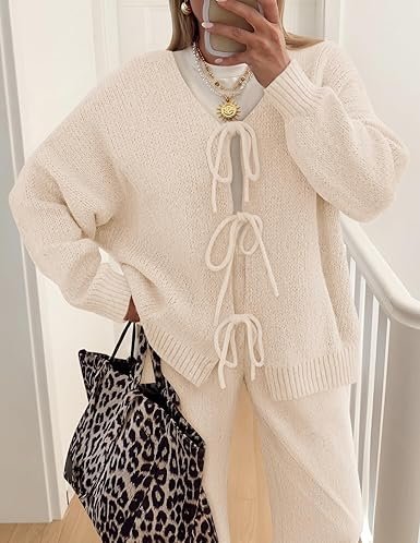 - V-neck cardigan with three ties on the front placket; paired with wide-leg pants with an elastic waist.